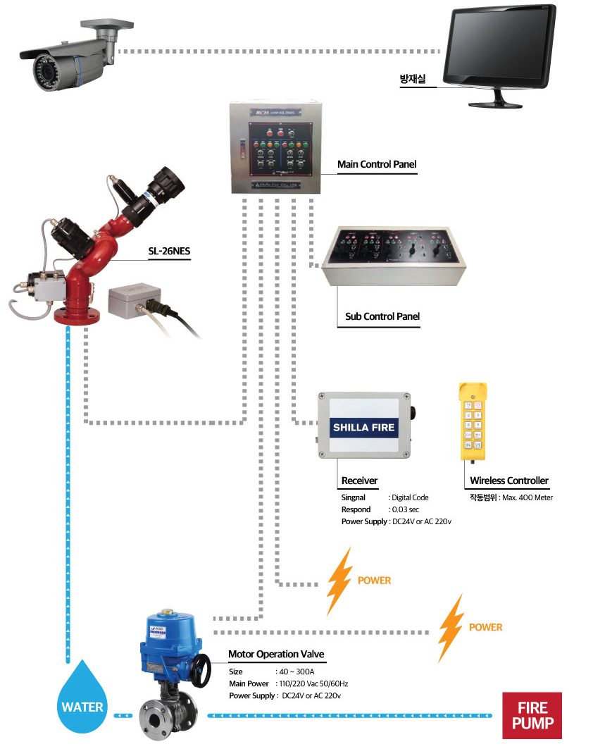 Open/close, rotation and flow pattern can be controlled from long distance to enable safe & efficient firefighting and prevention of spreading fire, and the product can protect people from danger. Additional equipments are all waterproof.