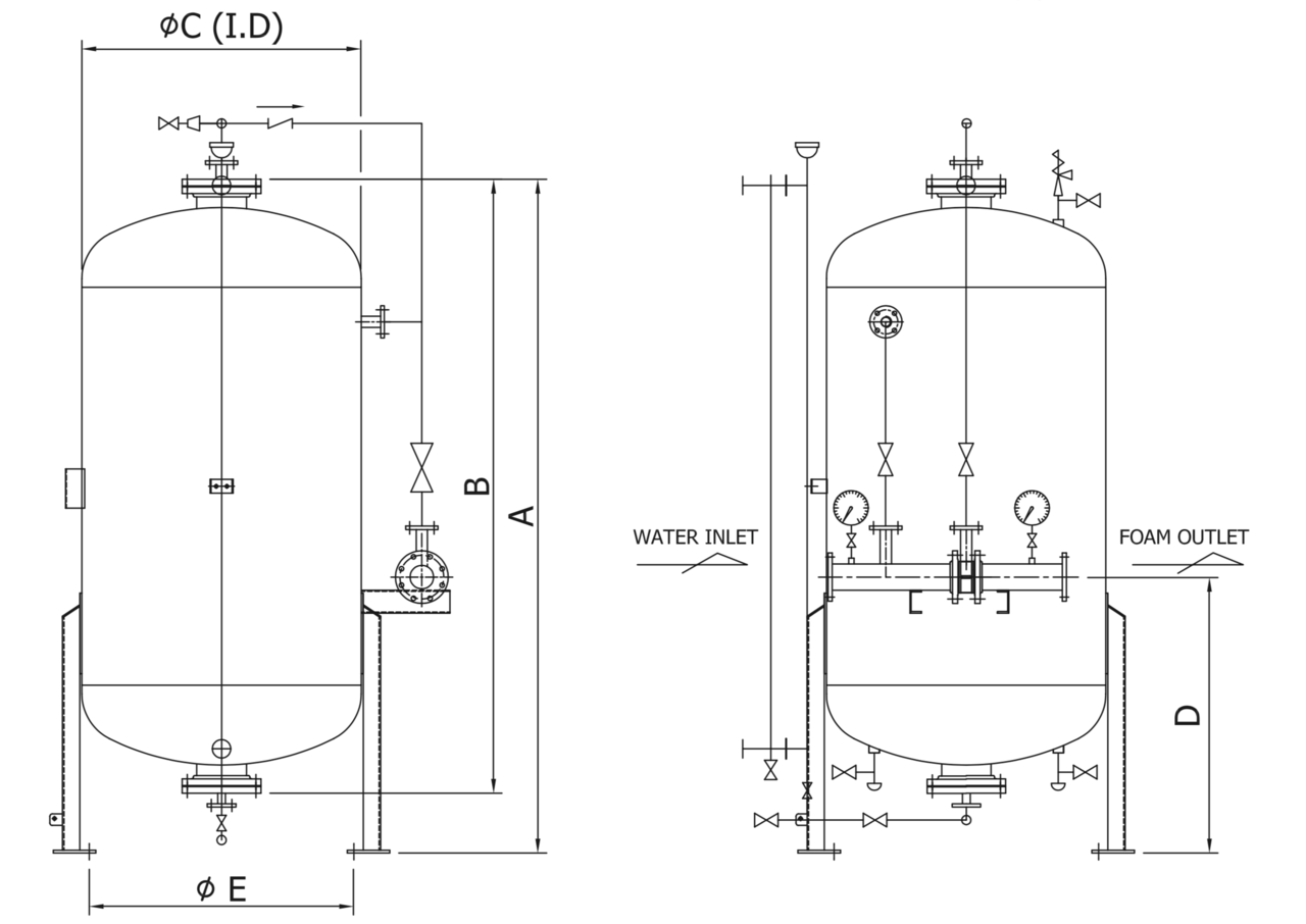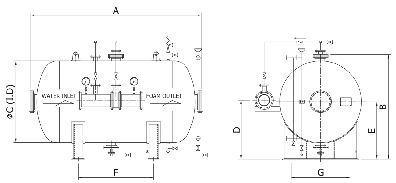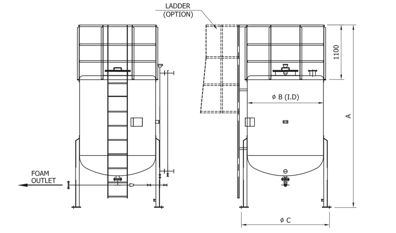 It is a tank for storing foam liquid installed with a pressure proportioner or a diaphragm pressure proportioner. A bladder bag is installed inside the tank, so foam liquid is stored inside the bag. The stored foam liquid is pushed by the pressure in the water supply line to be discharged and mixed with fire water. A tank is made of carbon steel. The inner wall is not in contact with the foam liquid but is in contact with water, so it is coated with anti-corrosion coating to prevent corrosion. The built-in bladder bag is made of a material that is not hardened or aged by the foam liquid and is not damaged by pressure, so that the lifetime is longer and more stable.